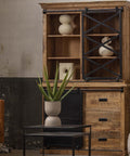 Over het massieve mangohout worden meerdere lagen houtolie en een blanke, natuurlijke bijenwas aangebracht om het hout te beschermen tegen vocht, vuiligheid en kringen. Het frame van de glazen schuifdeur, de onderste schuifdeur en de handgrepen zijn allemaal gemaakt van zwart gepoedercoat metaal.