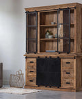 Over het massieve mangohout worden meerdere lagen houtolie en een blanke, natuurlijke bijenwas aangebracht om het hout te beschermen tegen vocht, vuiligheid en kringen. Het frame van de glazen schuifdeuren, de onderste schuifdeurtjes en de handgrepen zijn allemaal gemaakt van zwart gepoedercoat metaal.