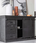 Het mangohout is massief en is eerst gezandstraald, waarna het behandeld wordt met zwarte verfbeits en tenslotte wordt afgewerkt met een donkere, natuurlijke bijenwas om het hout te beschermen tegen vocht, vuiligheid en kringen. De schuifdeur, de rails en de handgrepen van de lades zijn gemaakt van zwart gepoedercoat metaal.