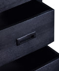 Het mangohout is massief en is eerst gezandstraald, waarna het behandeld wordt met zwarte verfbeits en tenslotte wordt afgewerkt met een donkere, natuurlijke bijenwas om het hout te beschermen tegen vocht, vuiligheid en kringen. De schuifdeur, de rails en de handgrepen van de lades zijn gemaakt van zwart gepoedercoat metaal.