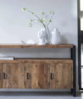 Het Pittsburgh-dressoir is een stoer dressoir met genoeg opbergruimte zowel in als uit het zicht door middel van de ruimte achter de vier deurtjes en de tussenruimte. Het dressoir is ook zeer geschikt als hoog tv meubel door de open tussenruimte, die benut kan worden om geluidsboxen of andere apparatuur te plaatsen.