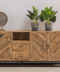 Voor het grootste dressoir uit de Reno-collectie wilt u zeker wel wat ruimte vrij maken! Dankzij het unieke motief heeft het meubel een stoere, maar toch ook chique karakter, zodat het meubel door iedereen gewild is. Het dressoir herbergt in de kastjes veel ruimte om grote spullen op te bergen en dankzij het open vak boven de twee ruime lades kan de kast ook als hoog televisiemeubel gebruikt worden.