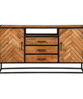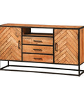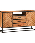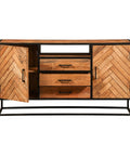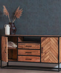 Een plekje vrij maken voor deze smalle variant van het Toronto dressoir is niet moeilijk. En daarnaast is het het ook nog eens een multifunctionele kast met een prachtig design. Het visgraatmotief in combinatie met het metalen frame is een perfecte toevoeging aan elk interieur, of dat nou industrieel, modern of landelijk is. Het meubel beschikt over drie lades en voldoende ruimte achter de twee deurtjes om spullen op te kunnen bergen. In het open vak kunnen bijvoorbeeld apparatuur, boeken of tijdschriften geplaatst worden.