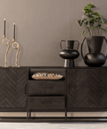 Dit zwarte dressoir uit de Toronto-serie barst van de mogelijkheden. Door het stijlvolle visgraatmotief heeft het meubel een elegante uitstraling. De open onderkant creëert daarnaast een ruimtelijk gevoel. Het meubel beschikt door de twee lades en de ruimtes achter de deurtjes over veel opbergmogelijkheden.