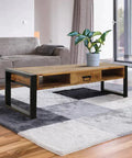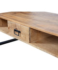 Deze stoere mangohouten salontafel Anaheim past in ieder interieur. De ruimte onder het hout geeft een ruimtelijk effect aan de salontafel. Aan de voor- en achterzijde van de tafel zit een lade en daarnaast is er nog voldoende ruimte in de open vakken om spulletjes in op te bergen.