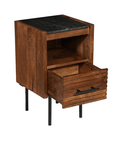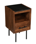 Bovenop het nachtkastje prijkt een prachtig blad van zwart marmer. Dit biedt niet alleen een stijlvolle uitstraling, maar ook een solide oppervlak voor uw nachtlamp, boeken en persoonlijke bezittingen.