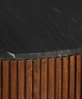 De tafel is uitgevoerd in een elegante walnootkleurige afwerking. Het marmeren bovenblad voegt een luxueuze tint toe en maakt van deze salontafel een absolute blikvanger in elke kamer.