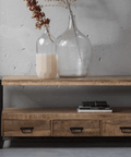 Mangohouten TV meubel Fresno is eenvoudig maar daarom juist een tijdloze toevoeging aan je interieur. Door de zwarte stalen accenten en het warme mangohout staat dit TV meubel prachtig in elke interieur. De vier lades geven voldoende opbergruimte en in de tussenruimte is er veel ruimte voor een receiver, een geluidsbox of andere apparatuur.