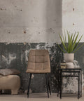 De tafelbladen van massief mangohout zijn eerst gezandstraald, waarna het behandeld wordt met zwarte verfbeits en tenslotte afgewerkt wordt met een donkere, natuurlijke bijenwas om het hout te beschermen tegen vocht, vuiligheid en kringen. Het metalen frame is behandeld met een zwarte poedercoat.