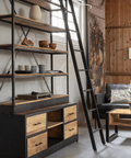 Over de planken van massief mangohout worden meerdere lagen houtolie en een blanke, natuurlijke bijenwas aangebracht om het hout te beschermen tegen vocht, vuiligheid en kringen. Het frame, de ladder en de handgrepen van de lades zijn gemaakt van zwart gepoedercoat metaal.