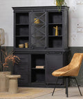 Het bovenste deel van deze buffetkast geeft je de mogelijkheid om je servies of andere decoratieve voorwerpen prachtig weer te geven een dankzij de glazen schuifdeur kunt u zelf bepalen welke stukken u wilt afschermen. Het onderste deel is voorzien van twee vakken achter een zwarte stalen schuifdeur en zes lades die u nog meer opbergruimte geven.