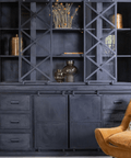 De zwarte serie van de Buffetkasten van de Denver-buffetserie is fraai en robuust. De kast springt door de combinatie van zwart mangohout en zwart staal bij iedereen in het oog en hij is toonaangevend tussen de rest van uw meubilair. De buffetkast bestaat uit twee delen: de bovenkant biedt u de gelegenheid om uw servies tentoon te stellen, terwijl de meest waardevolle stukken afgeschermd kunnen worden door de twee glazen schuifdeuren met metalen x-frame. De onderkant bevat zes lades en twee open vakken achter de zwartmetalen schuifdeuren waarin u allerlei andere eigendommen eenvoudig kunt opbergen.
