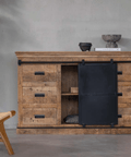 De krachtige dressoirs uit onze Newark-collectie zijn voor iedereen een aanwinst! Het meubel heeft niet alleen een uniek uiterlijk, maar barst ook nog eens van de ruimte. Het dressoir beschikt over zes lades en twee grote vakken die worden afgedekt door twee robuuste stalen schuifdeuren.