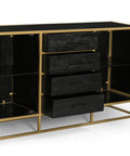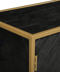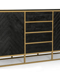 Het mangohout is massief en is eerst gezandstraald, waarna het behandeld wordt met zwarte verfbeits en tenslotte wordt afgewerkt met een donkere, natuurlijke bijenwas om het hout te beschermen tegen vocht, vuiligheid en kringen. Het frame en de handgrepen zijn gemaakt van goudkleurig gepoedercoat metaal.