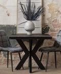 Het mangohout is eerst gezandstraald, waarna het behandeld wordt met zwarte verfbeits en tenslotte wordt afgewerkt met een donkere, natuurlijke bijenwas om het hout te beschermen tegen vocht, vuiligheid en kringen. Het blad met een dikte van 6 cm bestaat uit 3 cm massief mangohout en is met een extra strook van 3 cm aangedikt. De matrixpoten zijn gemaakt van zwart gepoedercoat metaal.