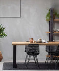 Over het mangohout worden meerdere lagen houtolie en een blanke, natuurlijke bijenwas aangebracht om het hout te beschermen tegen vocht, vuiligheid en kringen. Het blad met een dikte van 6 cm bestaat uit 3 cm massief mangohout en is met een extra strook van 3 cm aangedikt. De U-poten zijn gemaakt van zwart gepoedercoat metaal en er zit 209 cm tussen de poten.
