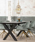 Het blad is eerst gezandstraald, waarna het behandeld wordt met zwarte verfbeits en tenslotte wordt afgewerkt met een donkere, natuurlijke bijenwas om het hout te beschermen tegen vocht, vuiligheid en kringen. Het blad met een dikte van 6 cm bestaat uit 3 cm massief mangohout en is met een extra strook van 3 cm aangedikt. De X-poten zijn gemaakt van zwart gepoedercoat metaal en er zit 108 cm tussen de poten.