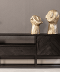Het massieve mangohout is eerst gezandstraald, daarna behandeld met zwarte verfbeits en tenslotte afgewerkt met een donkere natuurlijke bijenwas, zodat het hout beschermt is tegen vocht, vuil en kringen. Het frame en de handgrepen zijn gemaakt van zwart staal dat is afgewerkt met een zwarte poedercoating.