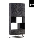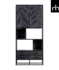 Deze zwarte vakkenkast uit de Toronto-serie is zeer compact waardoor hij nagenoeg in iedere ruimte past. Door de zwarte kleur en het visgraatmotief heeft de kast een elegante look die in vrijwel ieder interieur past. De vier lades, de open vakken en de ruimte achter de deurtjes zorgen voor veel opbergmogelijkheden. Dankzij de speelse indeling is de kast geheel naar eigen smaak in te richten.