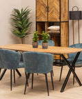 Deze Deens ovale eettafel Salerno is met zijn metalen X-poten een echte eyecatcher in de eetkamer. Het mangohouten blad zorgt voor een rustig geheel. Er is genoeg plek om mooie stoelen te combineren met deze houten tafel. Urenlang tafelen en gezelligheid is gegarandeerd met deze tafel. De eettafel is 240 cm lang en 110 cm breed. Genoeg ruimte om te borrelen of om aan te werken. Het afgeschuinde, dunne tafelblad laat de tafel nog verfijnder lijken en zorgt voor een strakke, elegante uitstraling.