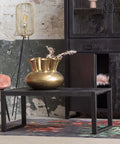 Het mangohout is massief en is eerst gezandstraald, waarna het behandeld wordt met zwarte verfbeits en tenslotte wordt afgewerkt met een donkere, natuurlijke bijenwas om het hout te beschermen tegen vocht, vuiligheid en kringen. Het tafelblad heeft een dikte van ongeveer 5 cm. De poten zijn gemaakt van zwart gepoedercoat metaal.