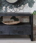Het mangohout is massief en is eerst gezandstraald, waarna het behandeld wordt met zwarte verfbeits en tenslotte wordt afgewerkt wordt met een donkere, natuurlijke bijenwas om het hout te beschermen tegen vocht, vuiligheid en kringen. De frames en de handgrepen zijn gemaakt van zwart gepoedercoat metaal. De bovenste plank heeft een dikte van 5 centimeter en de tussenruimte is ongeveer 20 centimeter hoog.