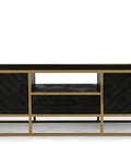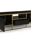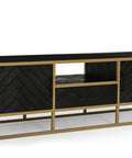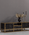 Dit stoere televisiemeubel uit de Napels serie is zeer uniek doordat het is afgewerkt met een visgraat motief en gouden accenten. Dit geeft het meubel een uniek, elegant karakter dat het meubel dé blikvanger van de ruimte maakt. Het meubel bevat veel opbergruimte in de lade en achter de ruime deurtjes. Het open vak kan gebruikt worden om apparatuur als een tv-ontvanger of een spelcomputer te plaatsen, waarvan de kabels eenvoudig aan de achterkant kunnen worden weggewerkt.