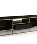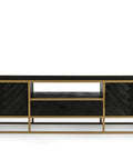 Dit zwarte televisiemeubel uit de Napels-serie is anders dan onze andere TV meubels doordat hij bewerkt is met een visgraat motief en gouden accenten. Dit geeft de kast een zeer chique uiterlijk dat meteen opvalt in de ruimte. In het open vak is veel ruimte voor apparatuur en de kabels kunnen eenvoudig aan de achterkant worden weggewerkt. Achter de twee ruime deurtjes is veel ruimte voor DVD's, CD's en computerspellen en ook in de lade kunnen allerlei accessoires worden opgeborgen.