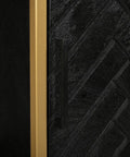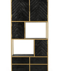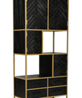 Deze zwarte met gouden accenten mangohouten vakkenkast is een lust voor het oog. De kast beschikt over voldoende opbergmogelijkheden in de open vakken, lades, deuren en om de kast te decoreren met stijlvolle accessoires, zoals bijvoorbeeld foto's of een bloemstuk. Het stijlvolle visgraatmotief van de deurtjes zorgt voor een unieke look in uw woonkamer.