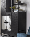 Deze mangohouten vakkenkast in het zwart is een lust voor het oog. Hij biedt voldoende opbergmogelijkheden met open vakken, lades en deuren en om de kast te decoreren met stijlvolle accessoires. De kast beschikt over vier deuren met stijlvol visgraatmotief, vier lades en twee ruime open vakken met twee planken om allerlei spullen in op te bergen.