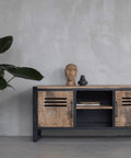 The Henderson TV cabinet is inspired by the well-known locker cabinet. The furniture is a sturdy combination of mango wood and black steel. There is plenty of storage space behind the doors and there is enough space on the shelves for a receiver or a game console.